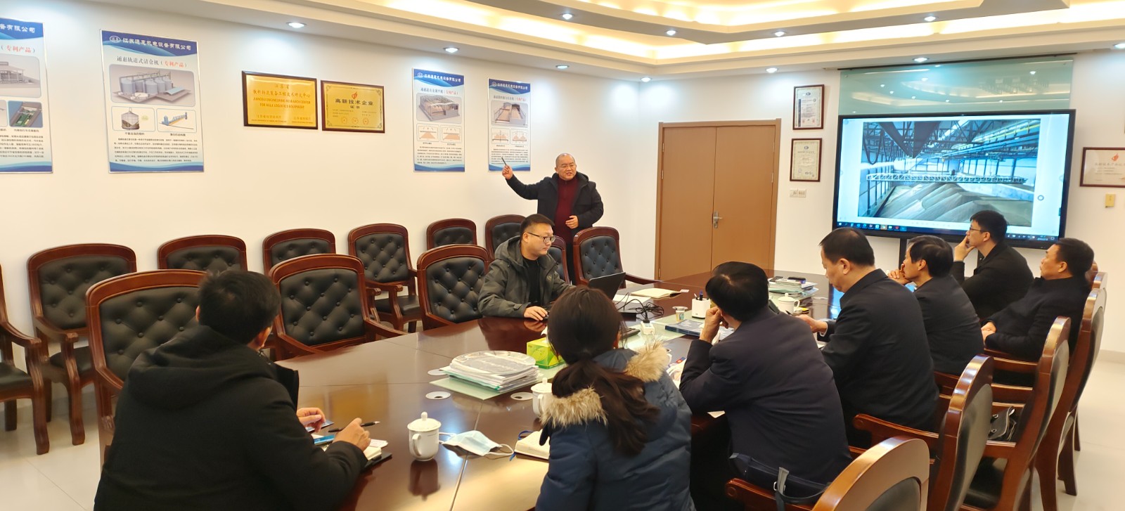 2022年2月10日,新年開工伊始,江蘇省泰州市海陵區(qū)政府領(lǐng)導(dǎo)團蒞臨江蘇通惠參觀考察,同時了解我公司產(chǎn)品——立筒倉臥式軌道清倉機、房式倉刮平機、房式倉散料強力出倉機、袋包裝船機、內(nèi)港池式袋包散料二合一裝船機等。
